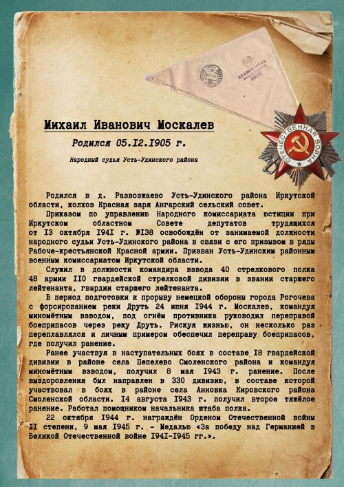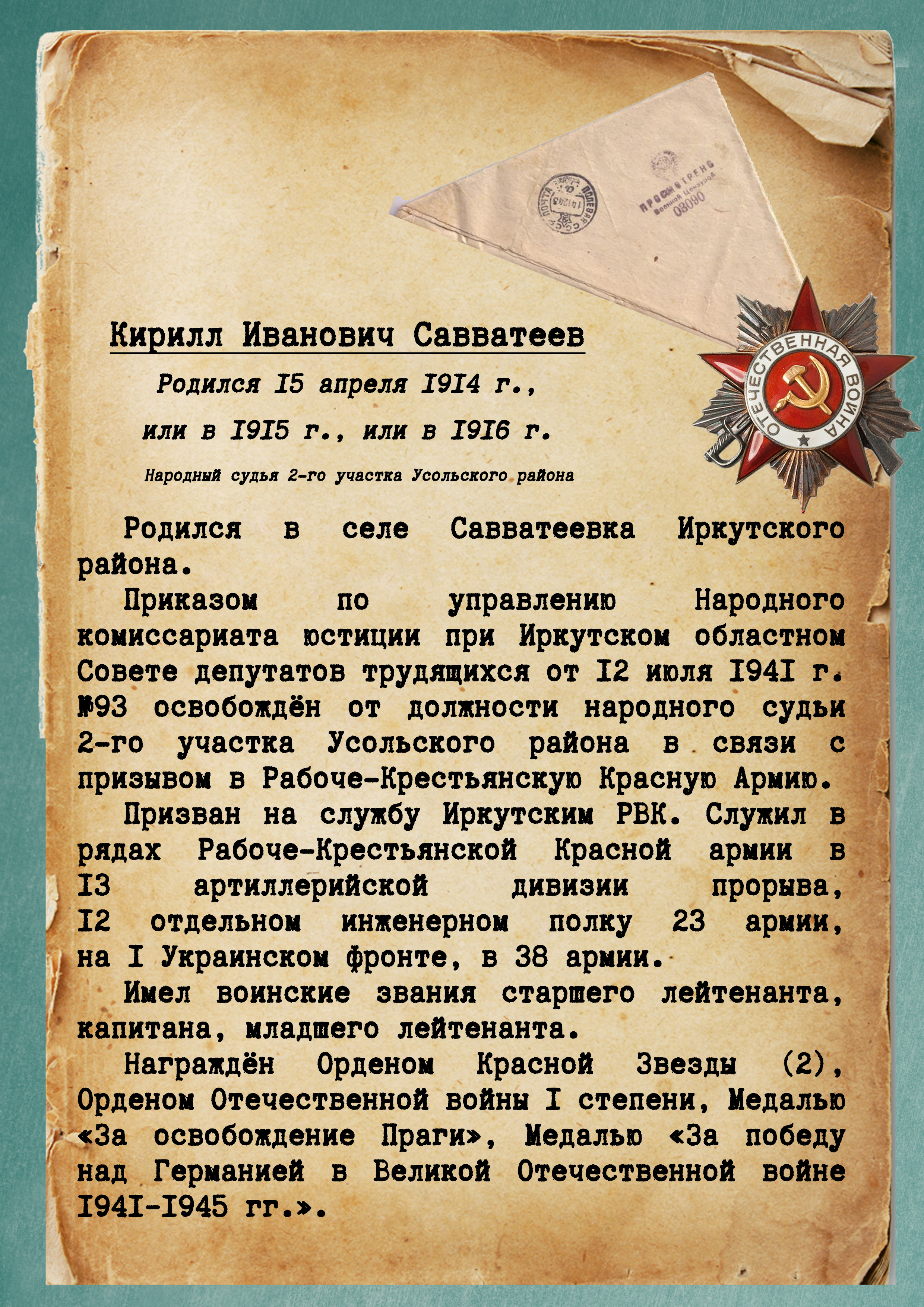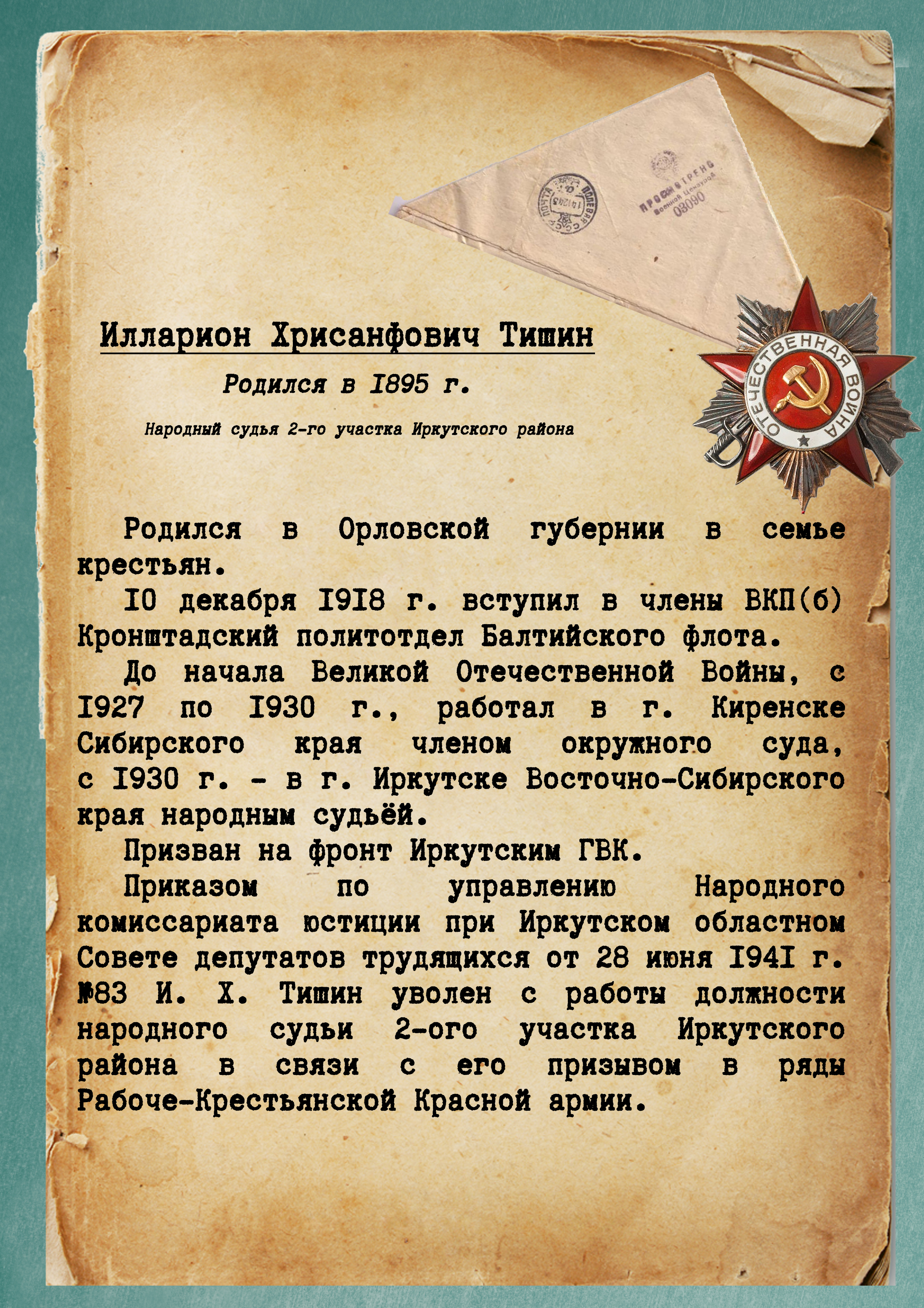 Итак, первые пять историй. 1) Илларион Хрисанфович Тишин был призван в первые дни войны –26 июня 1941 года... 2) Кирилл Иванович Савватеев. 12 июля 1941 г. № 93 он был освобождён от должности народного судьи 2-го участка Усольского района в связи с призывом в Рабоче-Крестьянскую Красную Армию... 3) Георгий Григорьевич Гаранин был призван на службу в Рабоче-крестьянскую Красную армию в июле 1941 г. Черемховским РВК. 4) Михаил Сидорович Баженов. 12 сентября 1941 г. он был освобождён от должности народного судьи 1-го участка Усольского района в связи с призывом в ряды Красной Армии... 5) Михаил Иванович Москалев. 13 октября 1941 г. он был освобождён от занимаемой должности народного судьи Усть-Удинского района в связи с призывом в ряды Красной Армии...