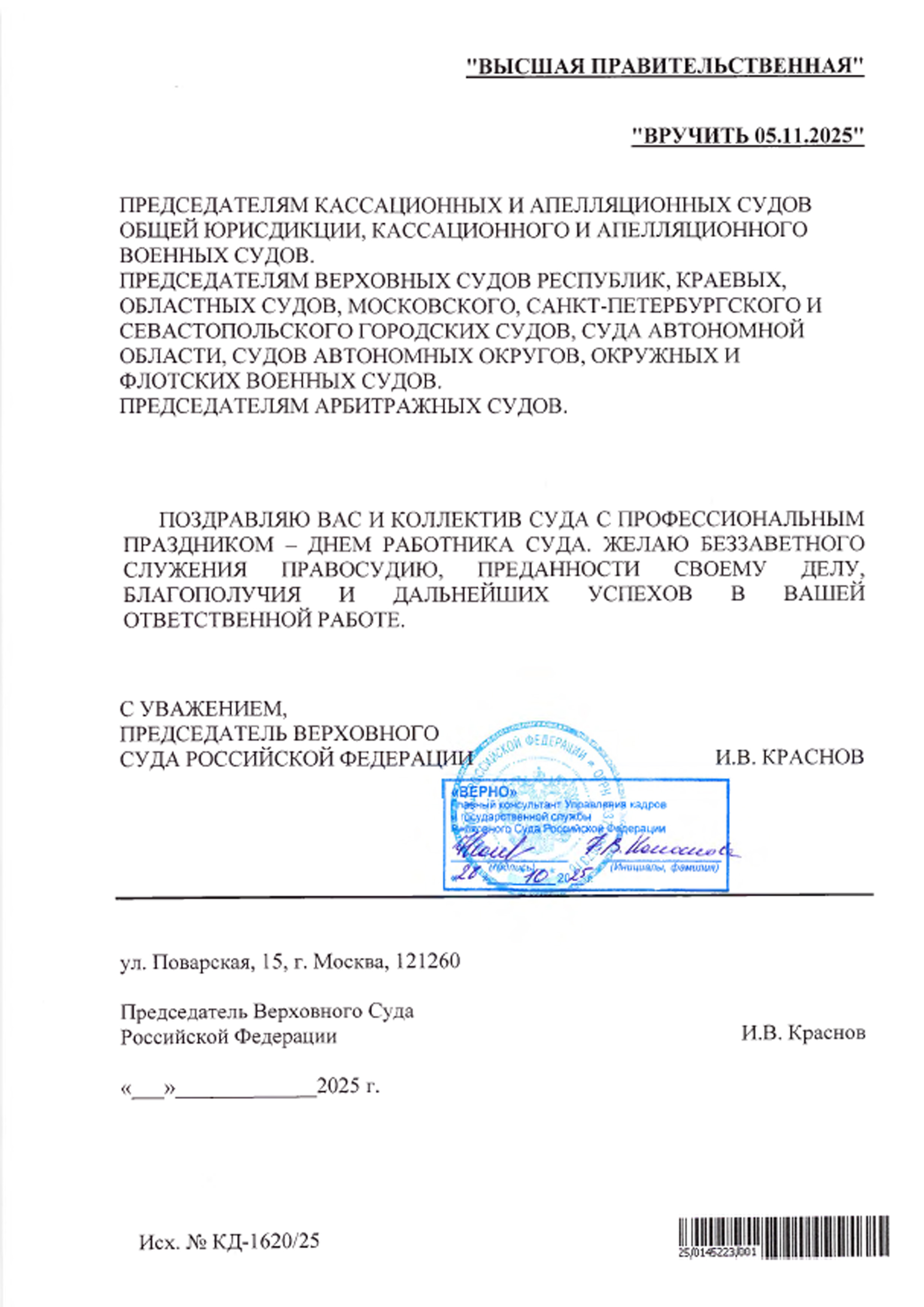 | Поздравление Председателя Верховного Суда Российской Федерации И. В. Краснова с Днем работника суда | версия для печати |